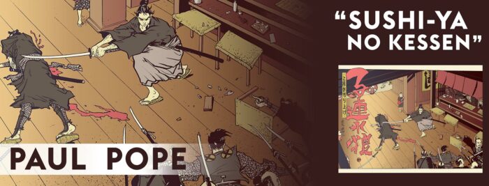“Sushi-ya no Kessen” (translated- “Sushi Shop Showdown”) is a 24 x 18 inch 8-color hand-printed silkscreen art print, limited to an edition of 150 copies worldwide. Each print is hand-numbered and stamped with Paul’s custom signature chop. Prints are $60 each, limit two per household.